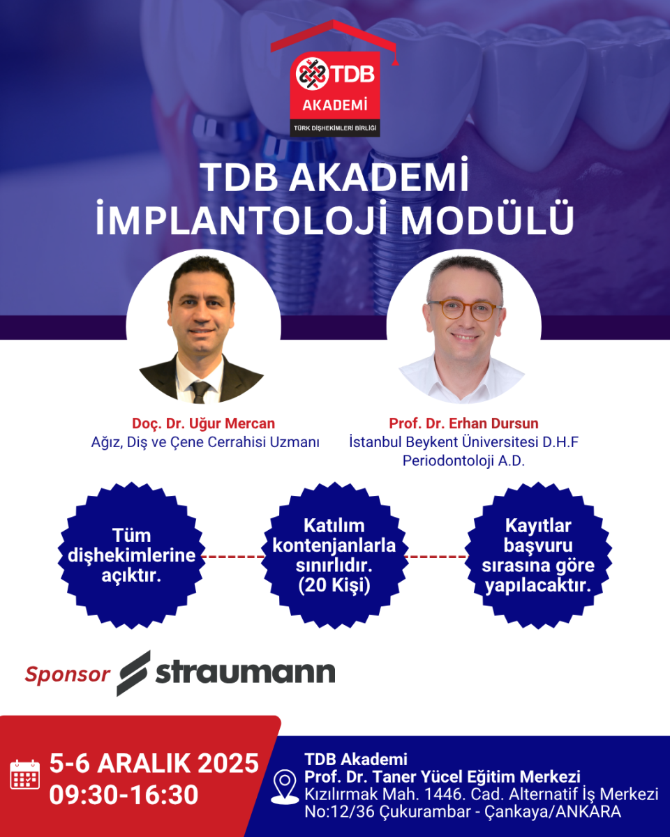 5-6 Aralık 2025 tarihlerinde TDB Akademi Prof. Dr. Taner Yücel Eğitim Merkezi’nde (Ankara) gerçekleştirilecek olan eğitimde değerli hocalarımız Doç. Dr. Uğur Mercan (Ağız, Diş ve Çene Cerrahisi Uzmanı) ve Prof. Dr. Erhan Dursun (İstanbul Beykent Üniversitesi D.H.F Periodontoloji A.D.) yer alacaklar.